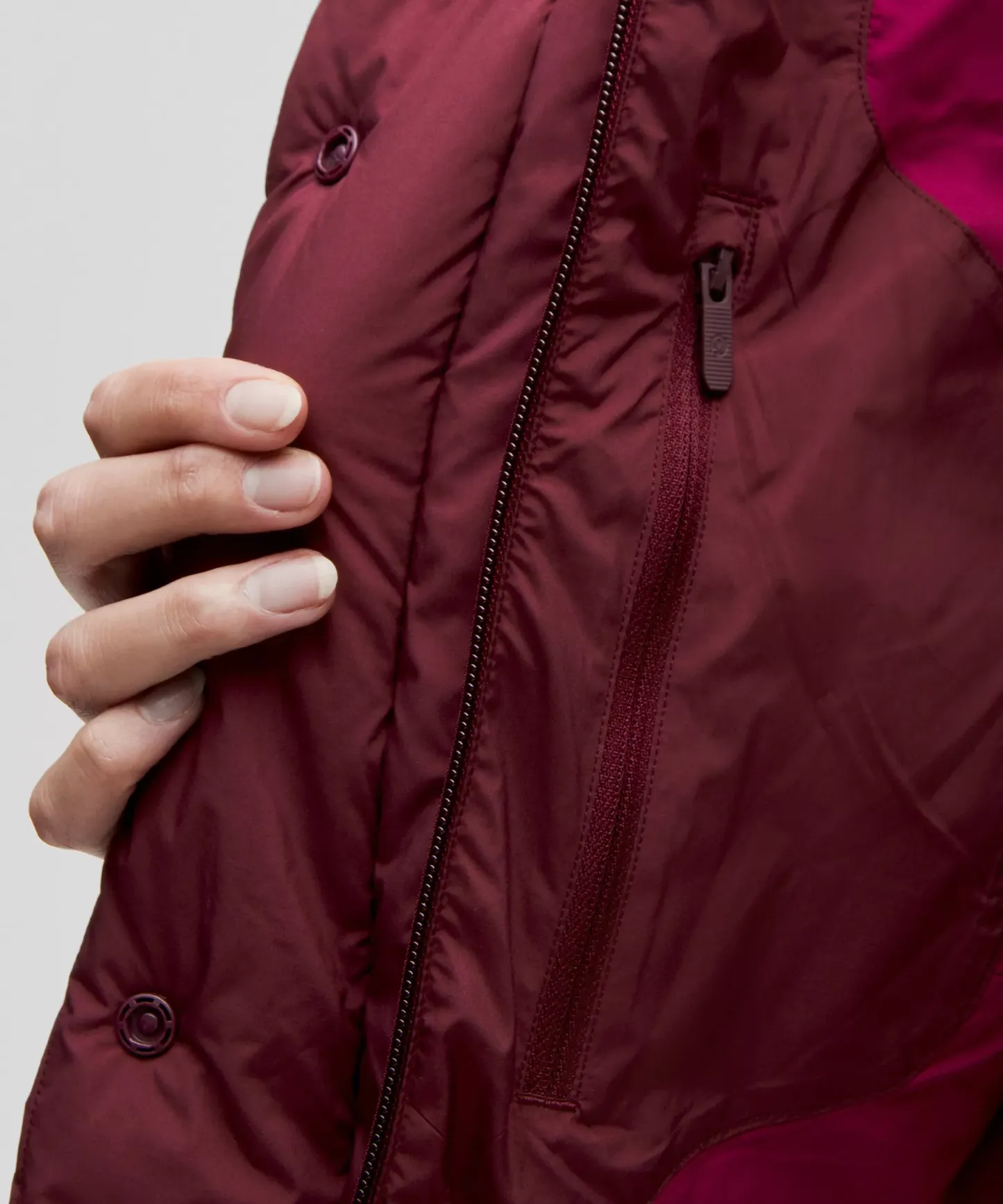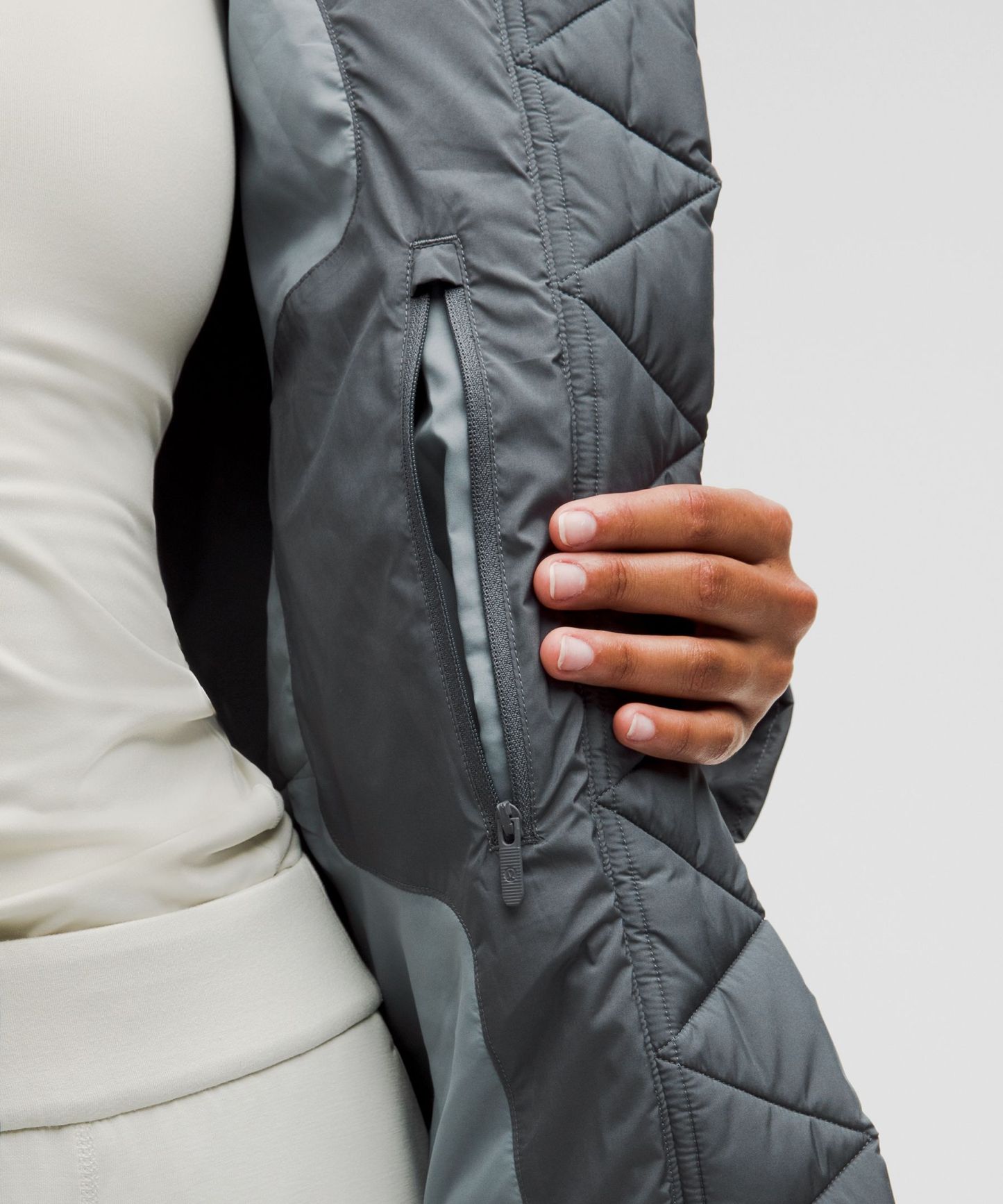 - Zippered hand pockets with a hidden phone sleeve