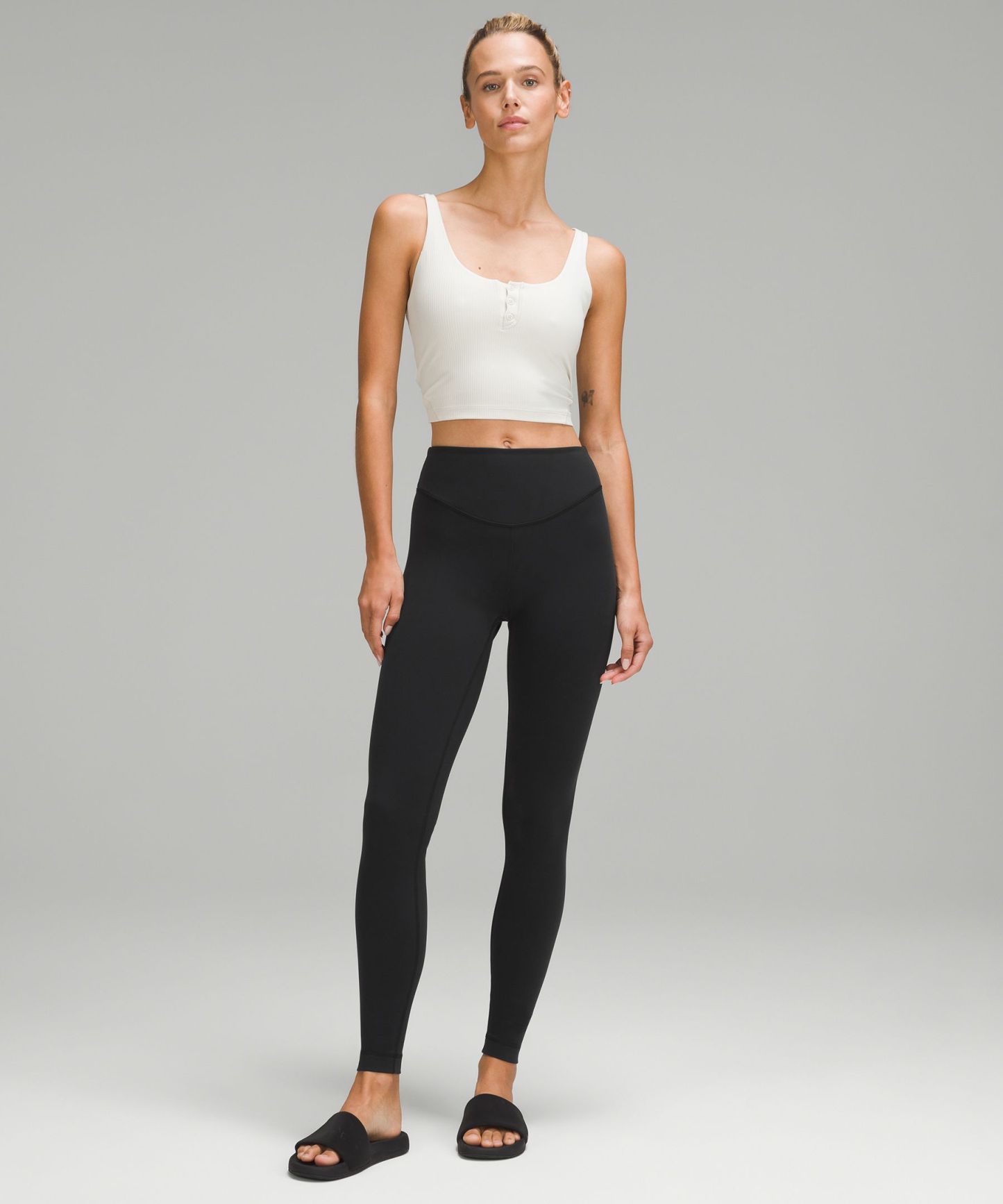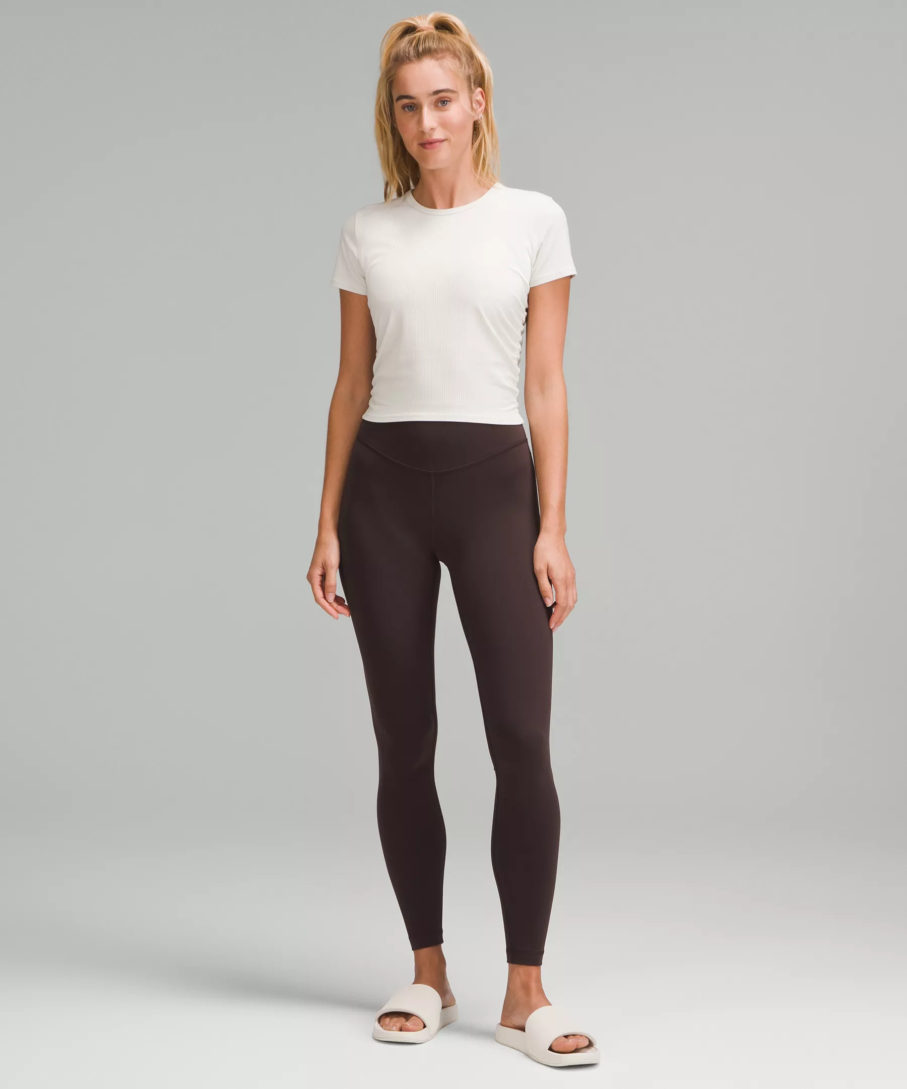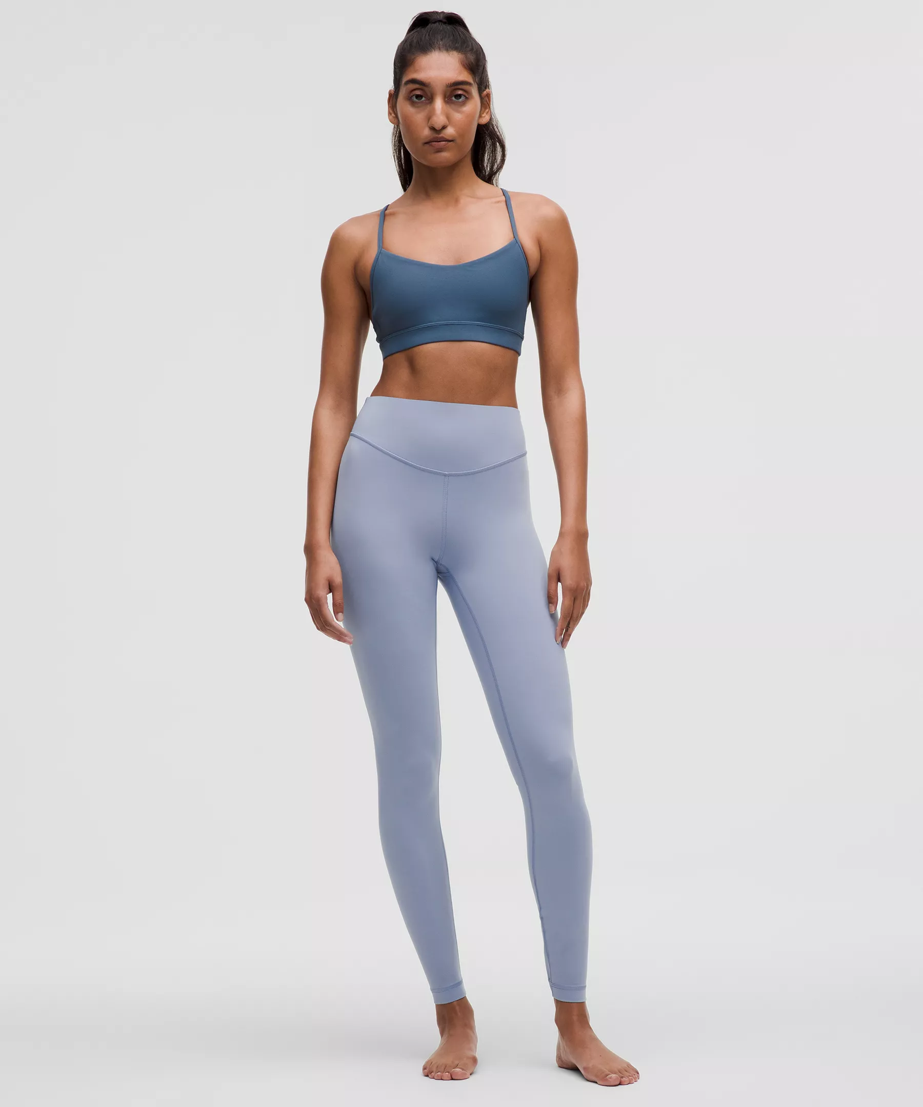 High rise keeps you feeling covered as you move. Our 28" length is intended to sit at your ankle.